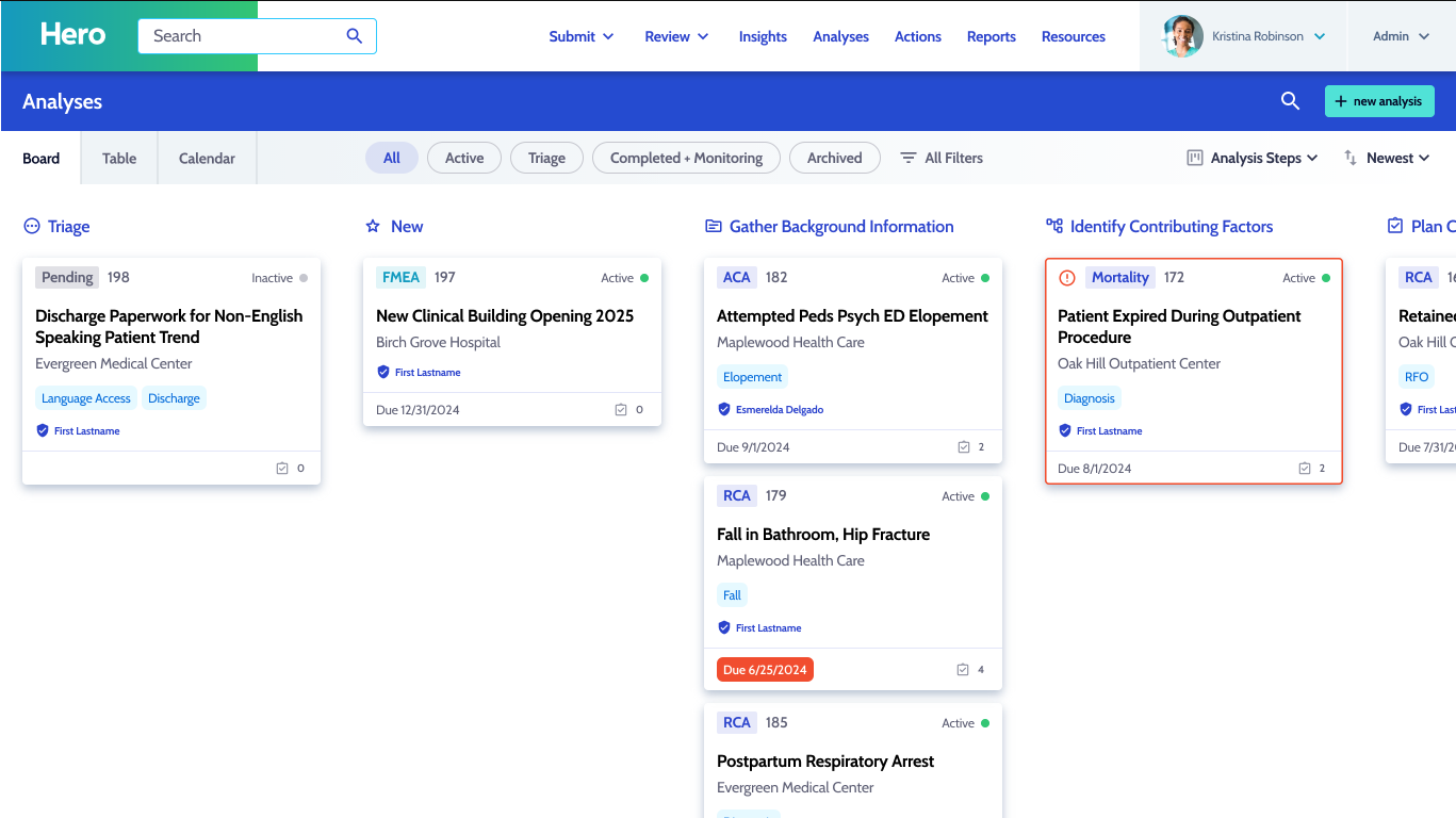 Whether you’re conducting a Root Cause Analysis (RCA), Apparent Cause Analysis (ACA), Common Cause Analysis (CCA), mortality review, or another investigative process, Horizon provides a single intuitive workspace. It helps teams identify contributing factors, define action items, and track progress.